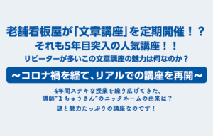 Press Release 2022.06 老舗看板屋が「文章講座」を定期開催!?それも5年目突入の人気講座!!リピーターの多いこの文章講座の魅力は何なのか?~コロナ禍を経て、リアルでの講座を再開~4年間ステキな授業を繰 […]