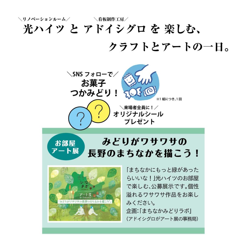 2010年以前は、古いビルは古いビル、価値などないという日本人の新築偏重に悩み、2011年、リノベーションを知り、光ハイツの1室を対象にリノベ案コンペ「artReno(アートリノー)」を開催。2013年に福岡でビンテージビル文化を創るスペースRデザインさんとアドイシグロの協働事業「長野ビンテージビルプロジェクト」がスタート。それから10年!リノベやイベントやビル管理等を続け、光ハイツは時間が経つごとに愛情が深まり、まちに愛される“ビンテージビル”へと熟成中です。
