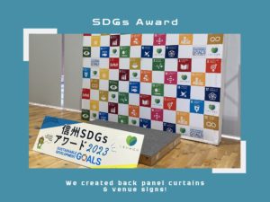 長野県からのご依頼で、SDGsのバックパネル用の幕、SDGsアワードの会場サインを制作させていただきました! 参加された方々がバックパネルを背景に思い思いに写真を撮ったりと、好評いただけたようです^^ アワードサインは、 […]