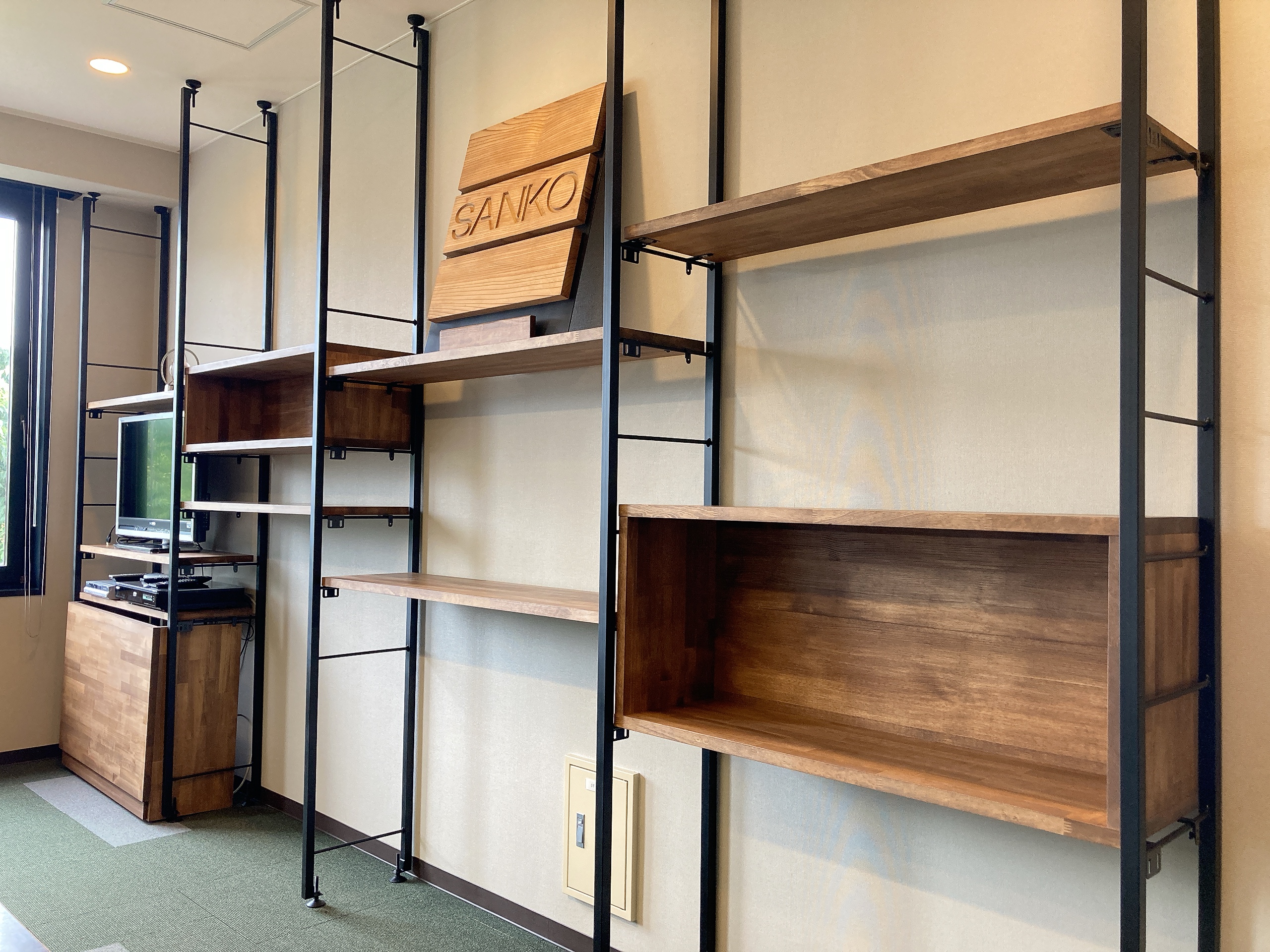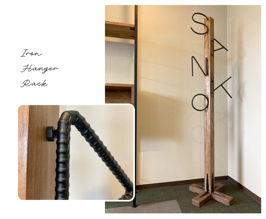 「SANKO」の文字を形作ったハンガーラックは、大人の遊び心を表しました。