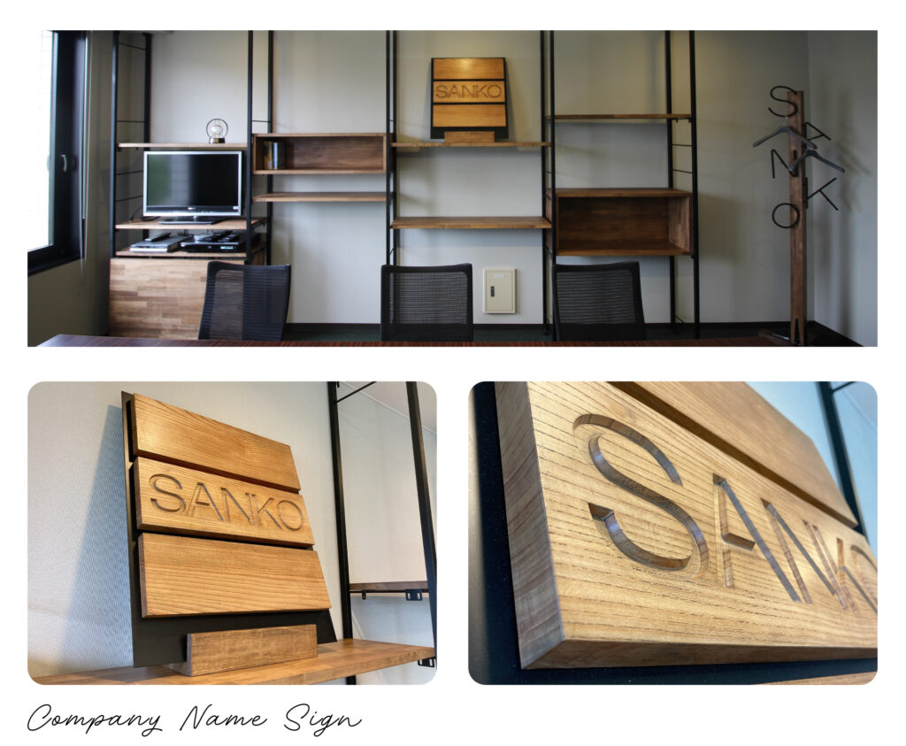 棚の上には、飯綱産の欅を使用した「SANKO」ロゴのサインを飾って。