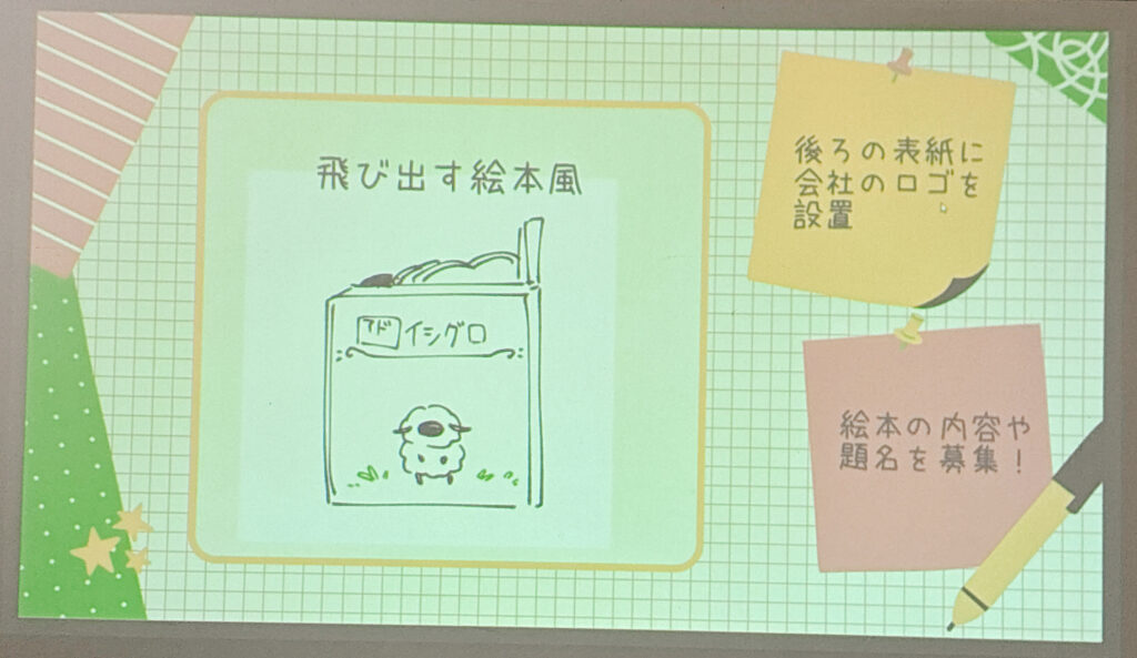 アドイシグロの社名を記すと同時に、登場人物であるひつじくんをプリントしてあるだけのシンプルなデザインとなっておりますが、そこでSNSを起用し「絵本の物語や題名を募集」する提案もしました。そうすることで参加型のミニイベントとなり、オブジェを通じた一体感が生まれるのではないかと考えたのです。