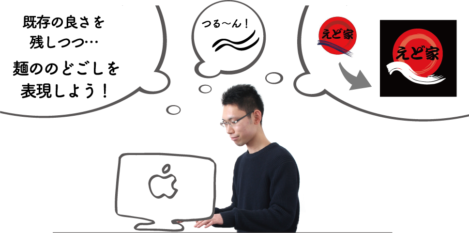 初期案では活気と食欲をそそる赤系のサインやレトロを演出する茶色ベースの案も有力でしたが、中華そばらしさや内装外装との調和や夜の景観も考えデザインを絞り込んでいきました。3代目も納得のデザインが出来上がりました。