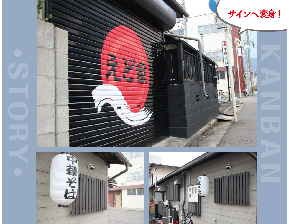 “麺の湯切り”と“のどごし”を想起させるイメージへ!動きのあるシルエットで、シャッターも中華そばの美味しさを伝えるサインへと大変身です。