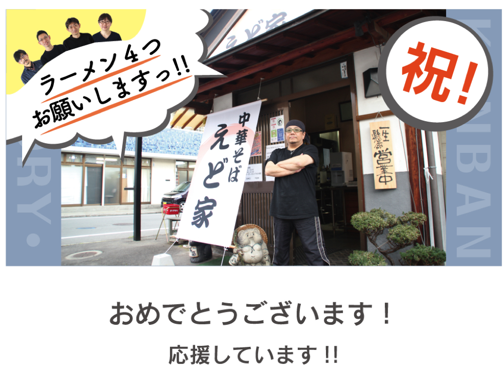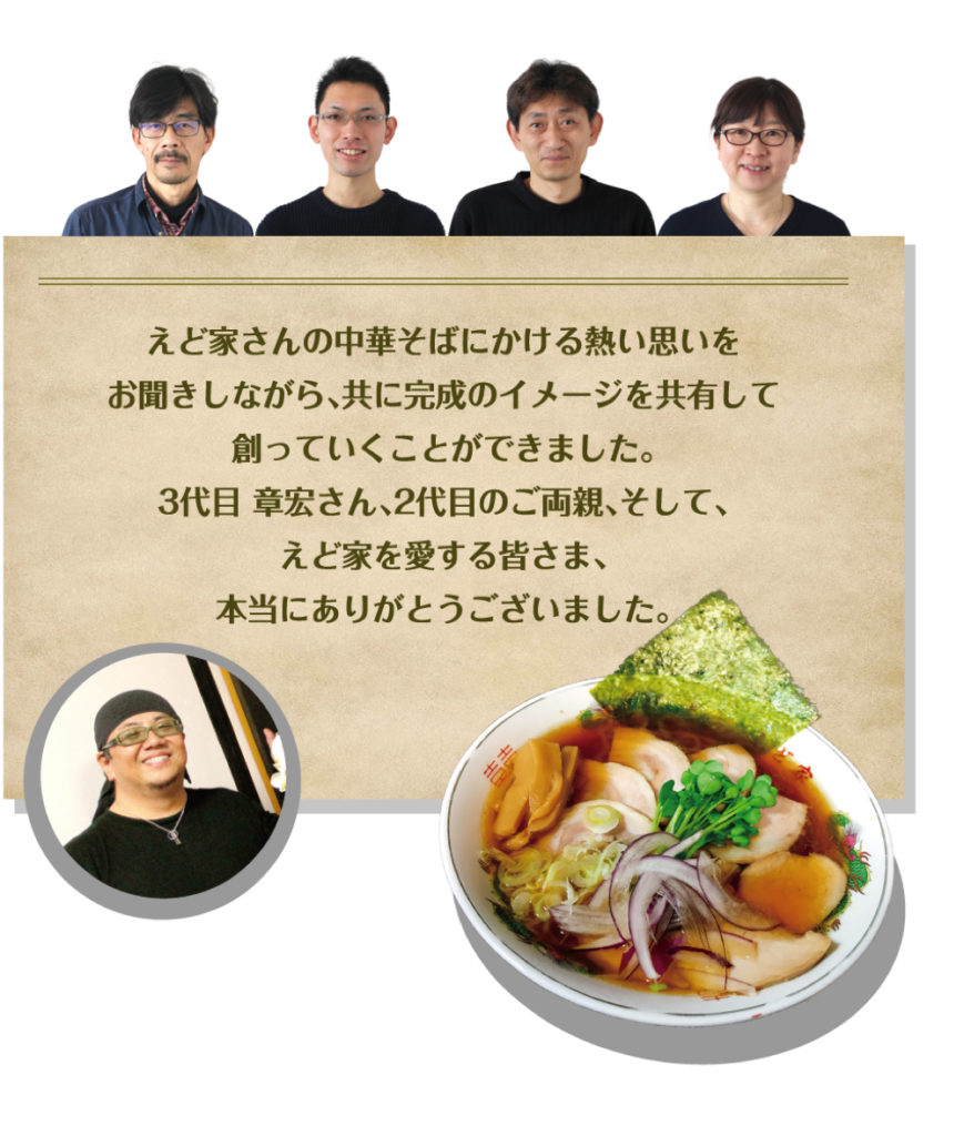 「えど家」さんは創業60年。アドイシグロと同じ東鶴賀町に店を構え、地元の人から長く愛され続けてきたごはん処。2代目のご両親をずっと支えてきた3代目章宏さんが今回の主人公です。長い年月「ごはん処 えど家」さんの愛され続けた味と、お客さんの憩いの場をつくり上げて来たご両親への尊敬と感謝を込めてそれらを引継ぎながらも、自身で研究を重ねている中華そば一本のお店に変えると決断。そんな3代目の新たなる挑戦の場「中華そば えど家」さんが、街で耀き始めるまでの物語です。(拍手!)