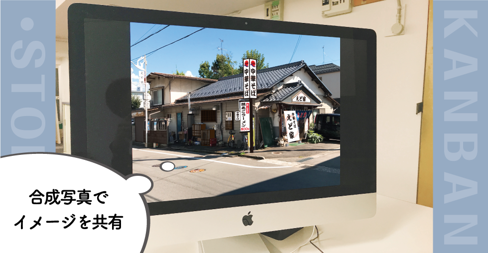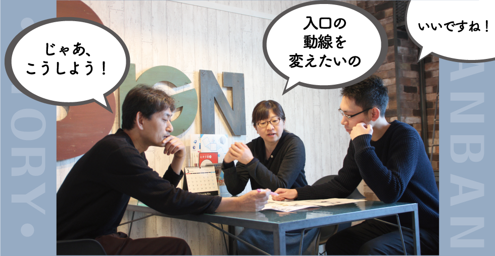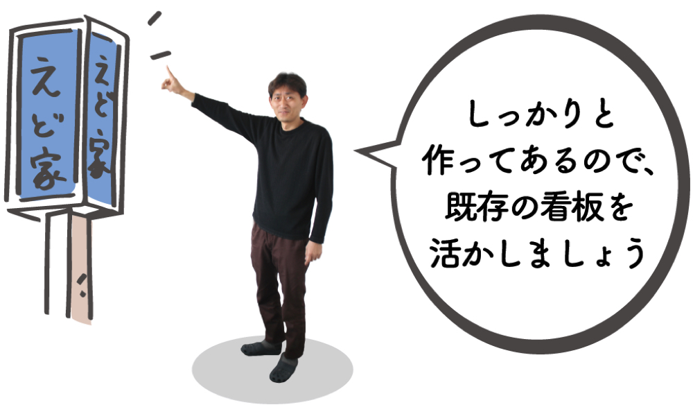 既存看板やお店の各部分を見ながら、3代目の熱い想いをどう形にしていくか現場で打合せです。